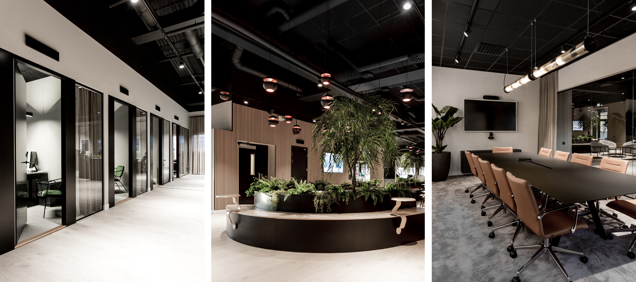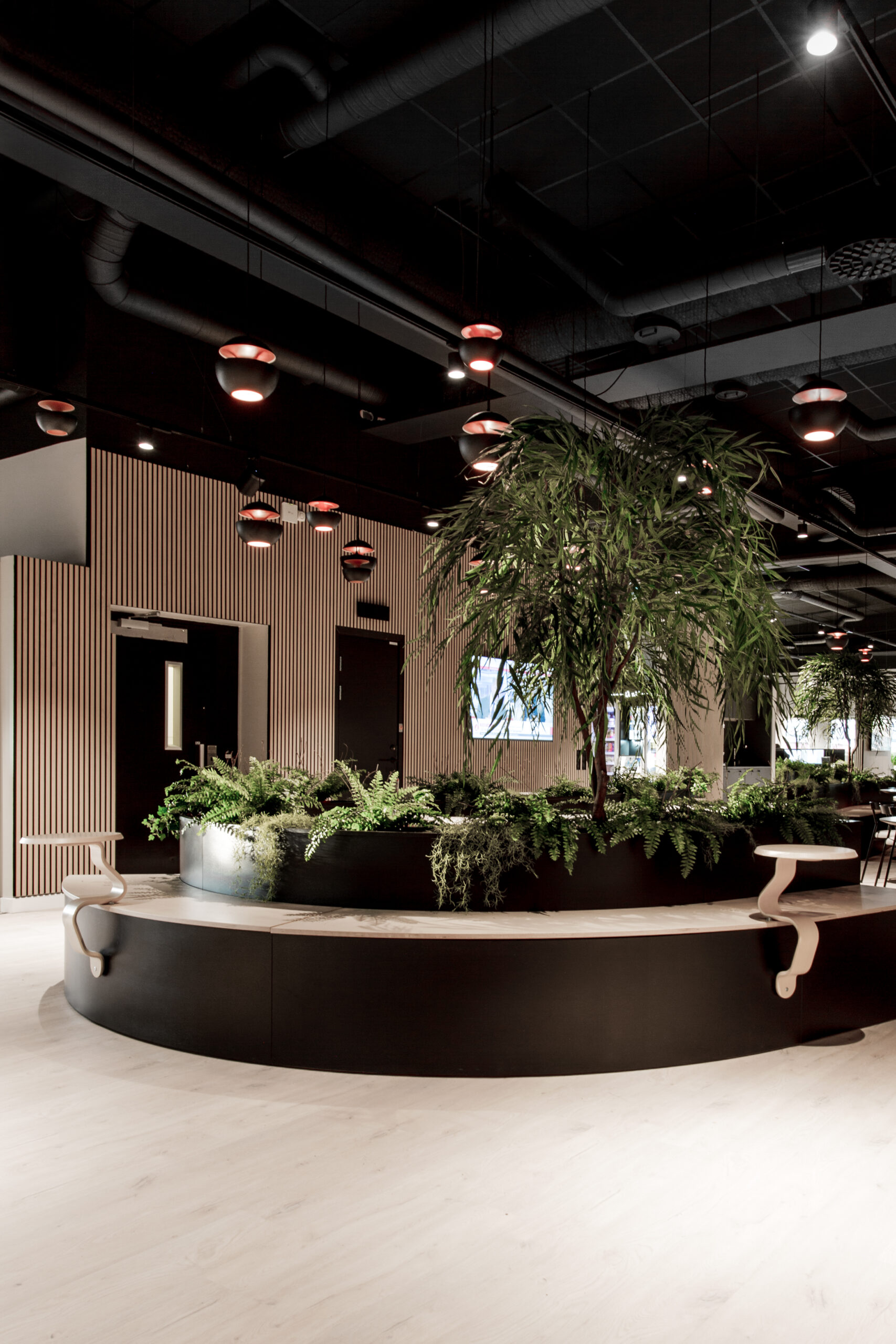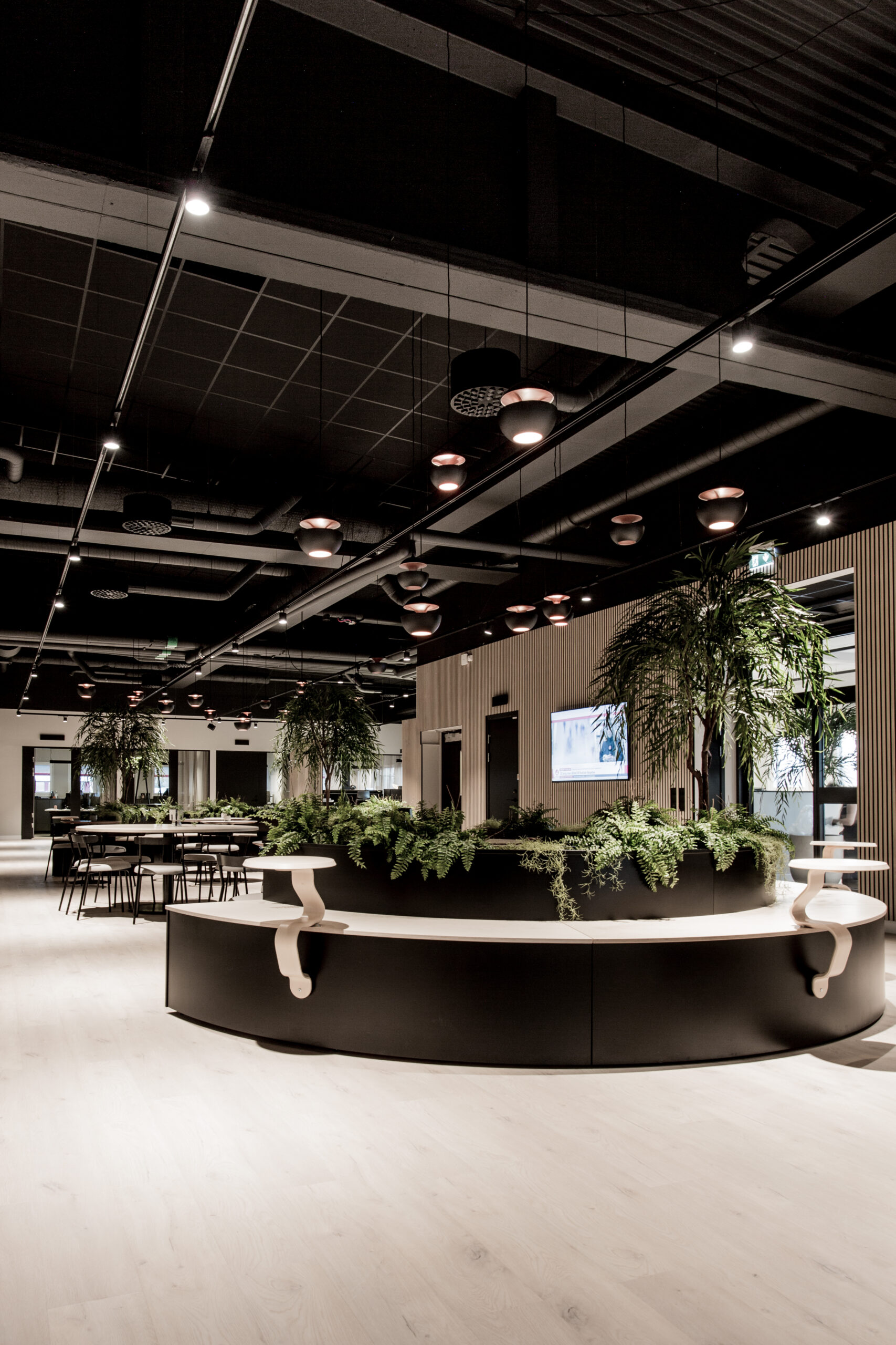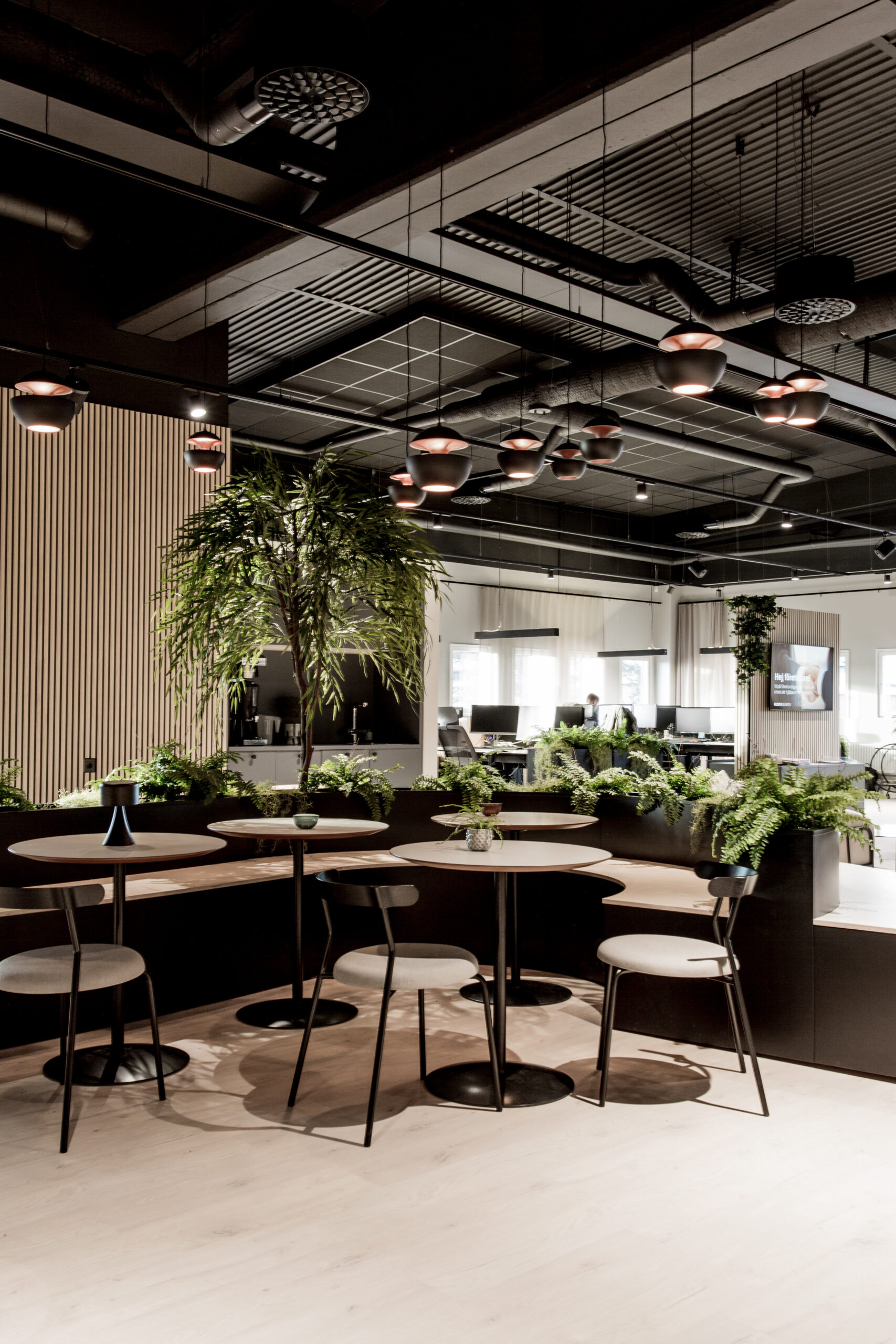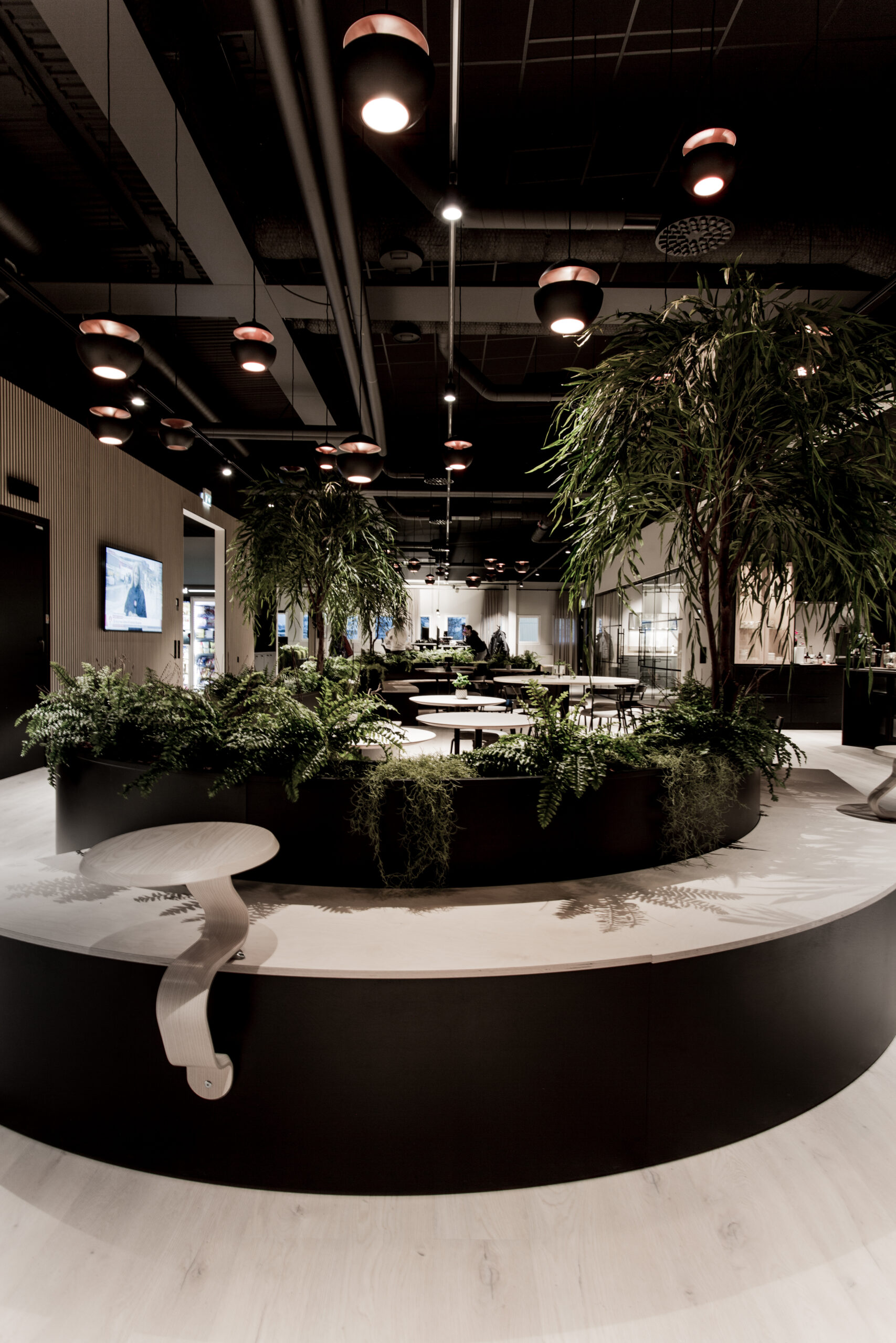 Rumsavdelare ger intrycket av att man har flera mindre rum på en större yta utan att tappa känslan av en gemensam samlingsplats. Vi valde bland annat att inreda med olika växtväggar i organiska former för att mjuka upp hela mittdelen och skapa ett välkomnande och trivsamt intryck. Vi designade även med några rumsavdelare i form av småväggar som markerar och möjliggör gruppindelning även om man sitter i en större yta.