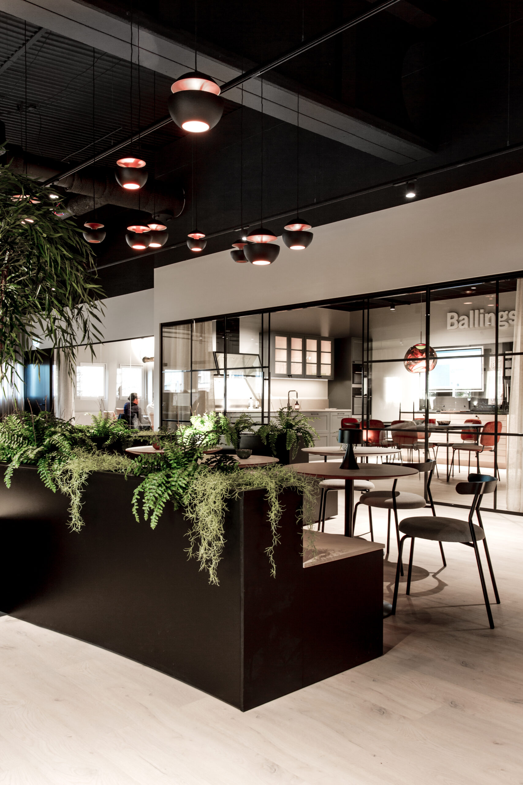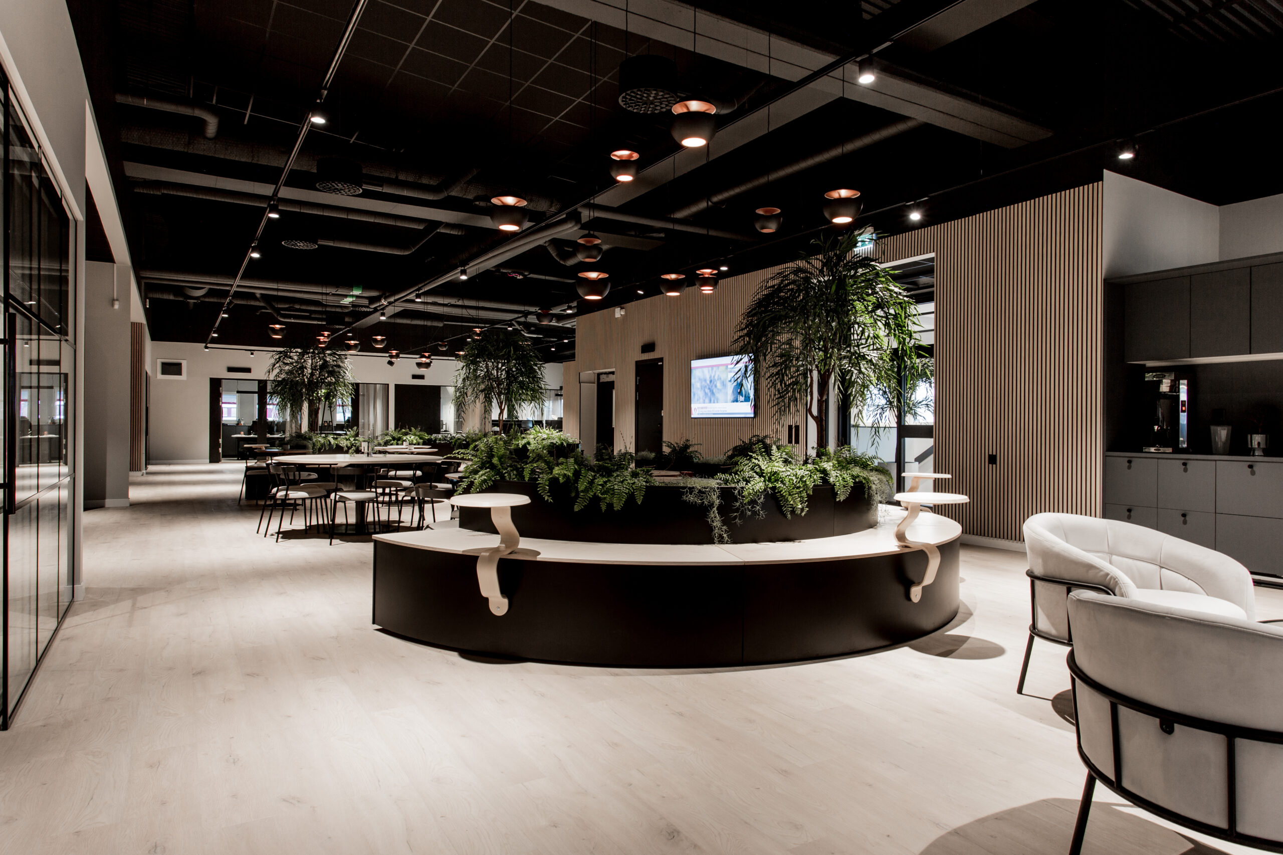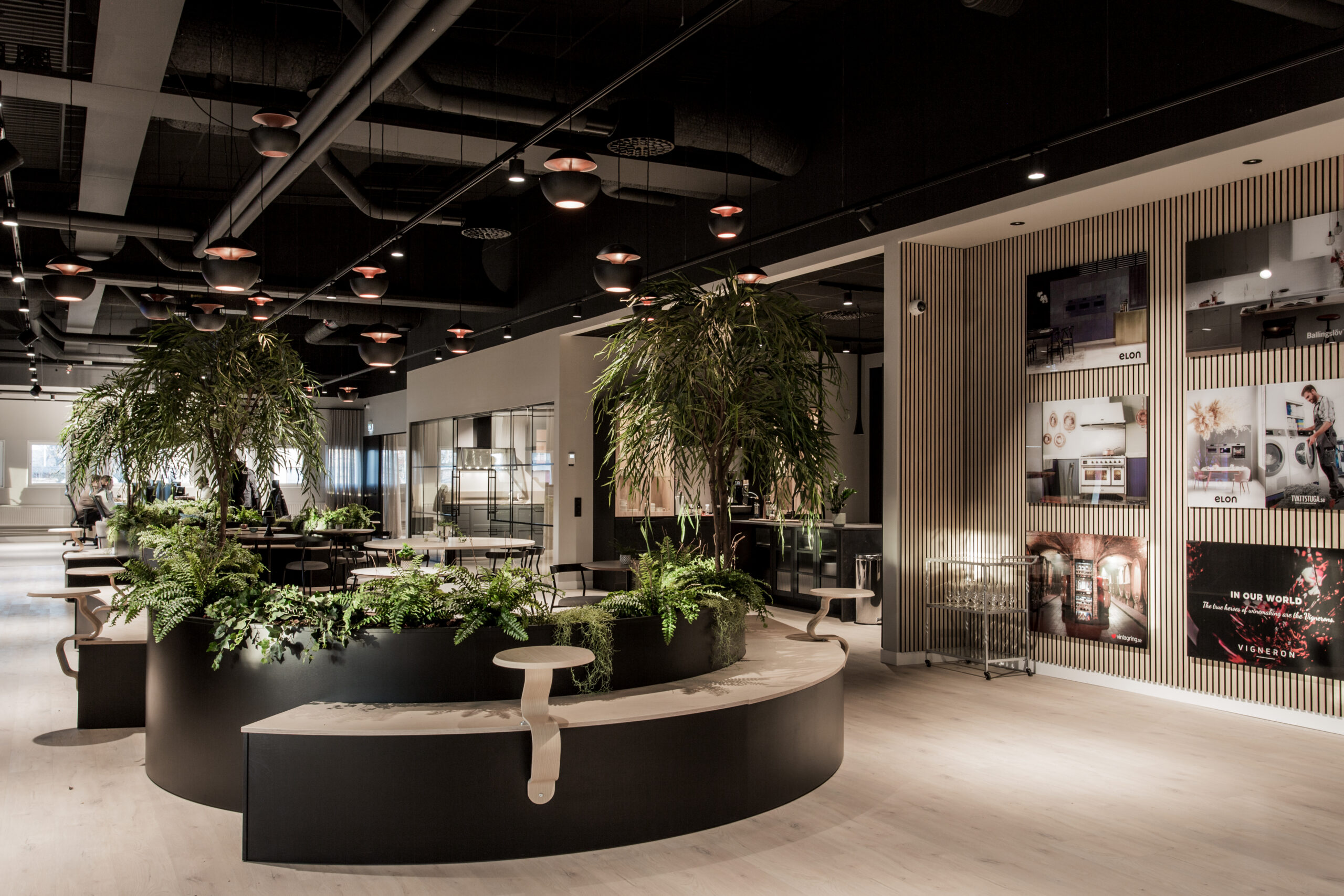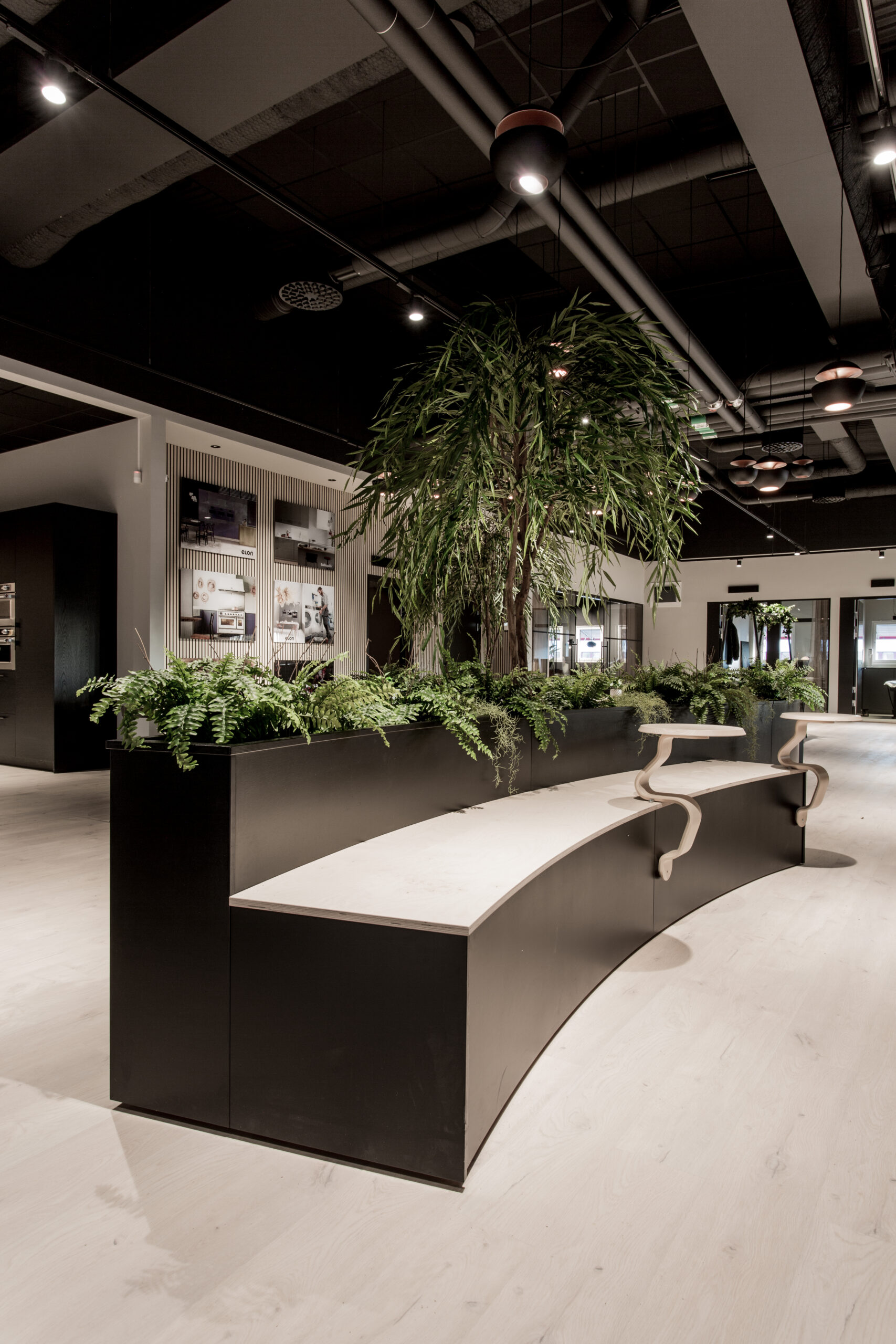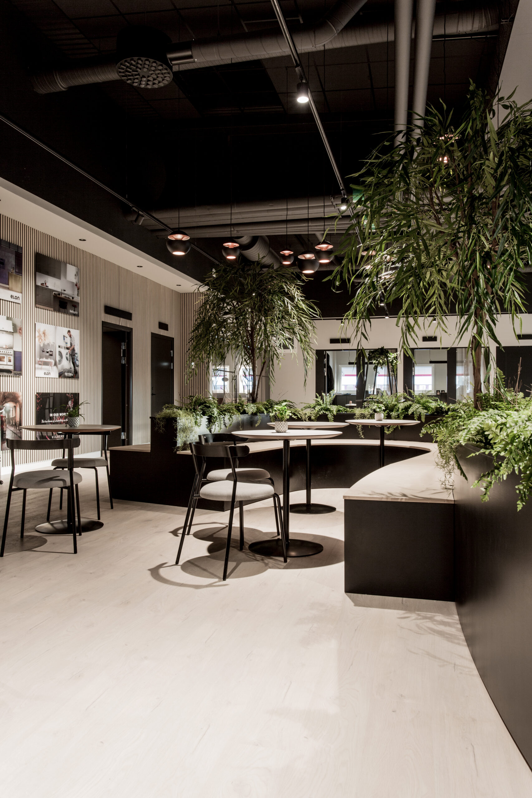 Rumsavdelare ger intrycket av att man har flera mindre rum på en större yta utan att tappa känslan av en gemensam samlingsplats. Vi valde bland annat att inreda med olika växtväggar i organiska former för att mjuka upp hela mittdelen och skapa ett välkomnande och trivsamt intryck. Vi designade även med några rumsavdelare i form av småväggar som markerar och möjliggör gruppindelning även om man sitter i en större yta.